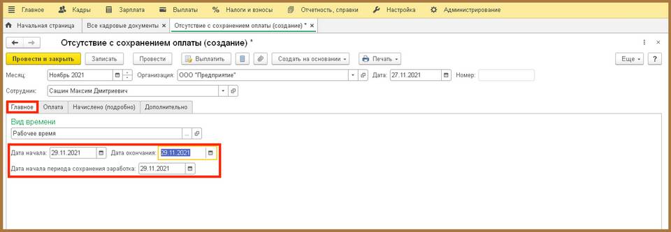 - Отражение в табеле учета рабочего времени